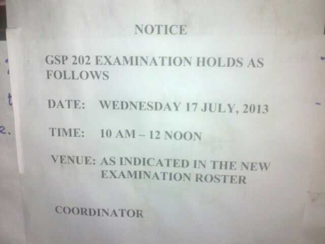 GS 202 Examination Re-Scheduled To Wednesday 17th July 2013