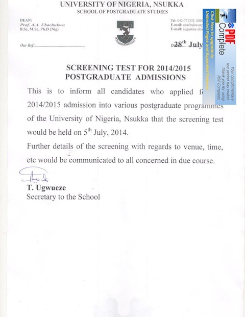 The University of Nigeria Nsukka has announced the screening test date for all prospective postgraduate students for the 2014/2015 session.