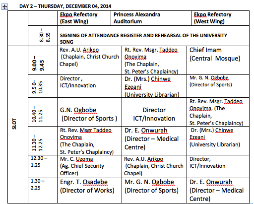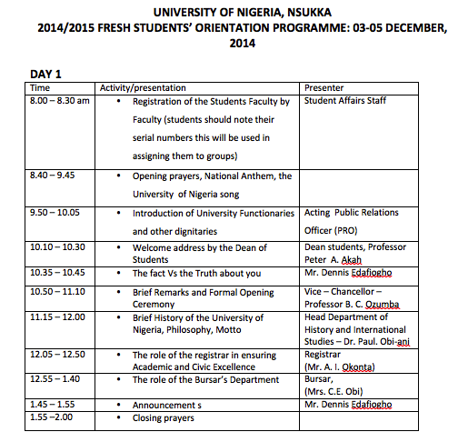 UNN Fresh Students Orientation Programme 2014/2015: Time table of Events